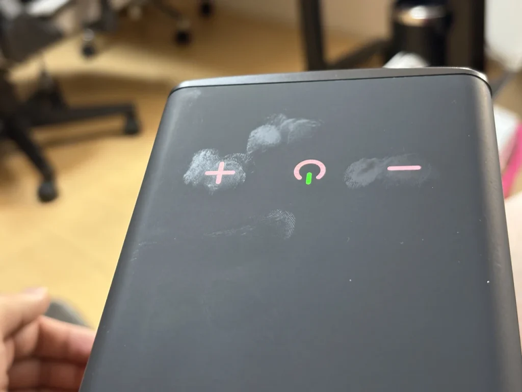 これは個人的に悲しかったポイント。タッチ前提の筐体なのに、ものすごく指紋がつきやすいです。ブラックだからかもしれませんが、こうなるくらいならシボ加工の無塗装プラスチックの方がいいと思いました。