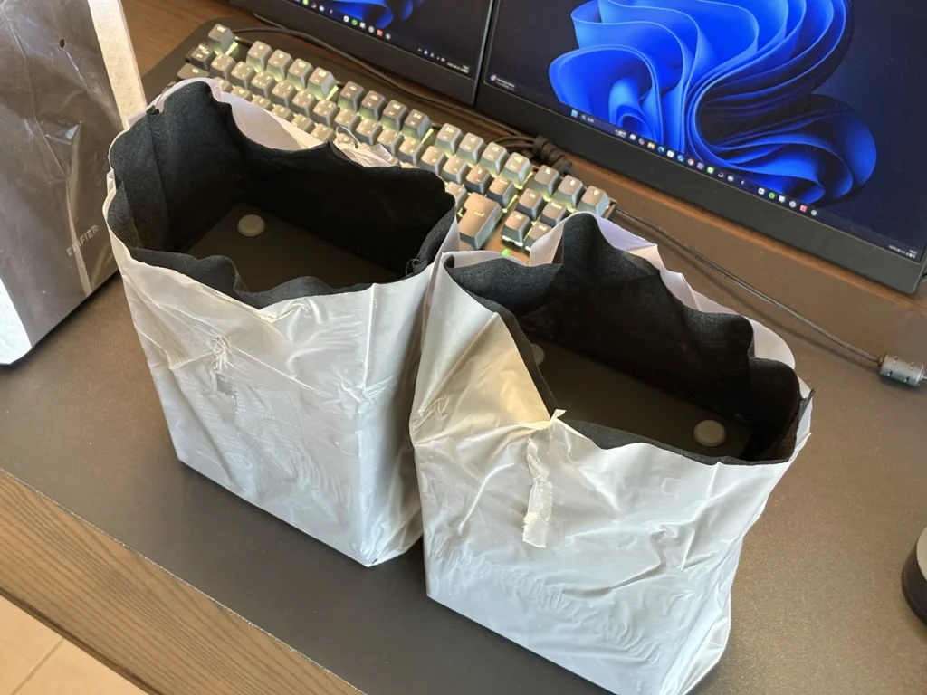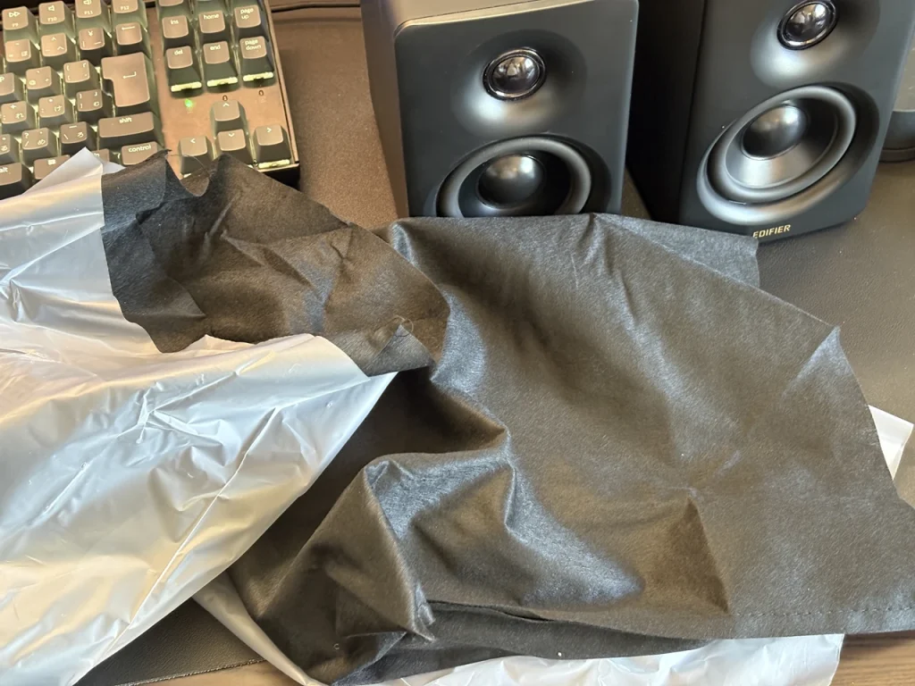 不織布袋ビニール袋の2重梱包。前回レビューしたMP330の時も同じ梱包でしたが、これ好きなんですよね。緩衝材の役割ももありつつ防湿的な効果もありそうで、音響機器の梱包としては120点だと思います。(あと、高級感。)