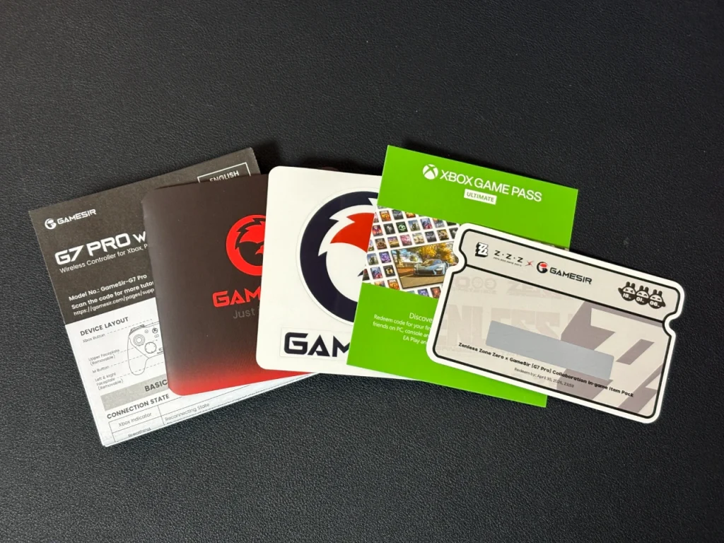 紙類は取扱説明書やステッカー、「XBOX GAME PASS ULTIMATE」の1ヶ月体験コードとゼンゼロのゲーム内アイテムがもらえるコードがついています。