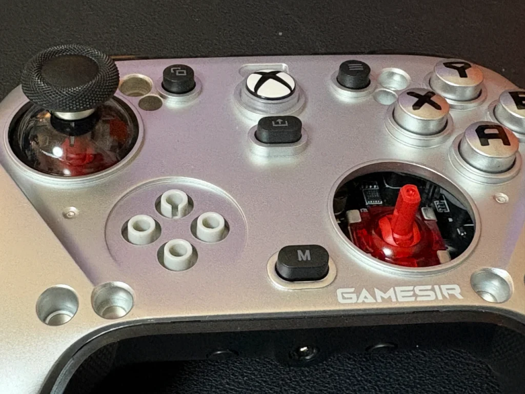 前面には光学式のマイクロスイッチのABXYボタン(ボタンのフォントがゼンゼロ仕様)、左右のサムスティックはドリフトしづらいTMRスティック。