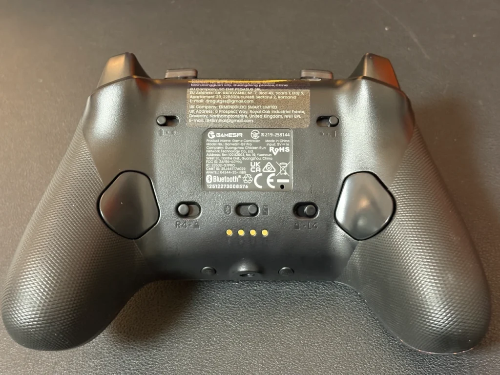 背面にはL4・R4とそのボタン入力の有効/無効を切り替えるスイッチ、トリガーのストロークの有無を切り替えるスイッチ、無線時の接続モードを切り替えるスイッチがあります。充電ドックと接続するときの接点も背面にあります。