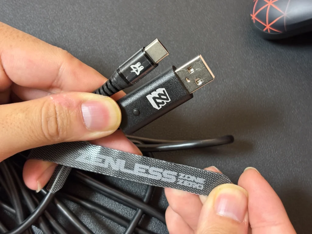 ケーブルの先端にはゼンゼロのロゴやボンプが印刷されています。ケーブルタイにまでゼンゼロの文字が。