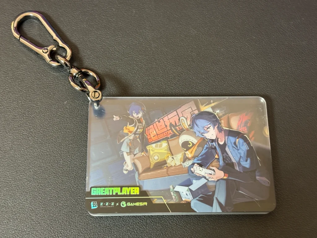 キーホルダーは、ゼンゼロの主人公であるリンちゃんとアキラくんとイアスが一緒にゲームをプレイするイラストのアクリルキーホルダーです。二層になっていて前面にアキラ、後後面にリンとイアスが描かれています。少し汚れて見えるのは保護フィルムです。(本気でコレクションとしてとっておきたいので、本レビューでは剝がしませんごめんなさい。)