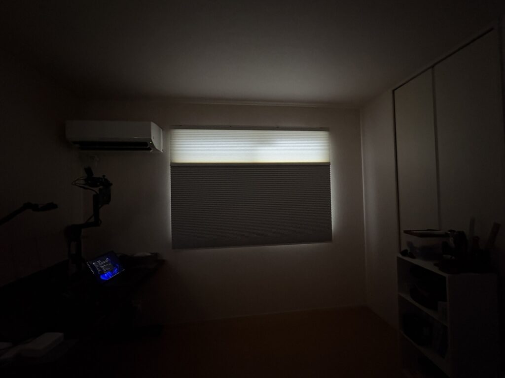 今回は少し特殊な取り付けをしているので横から光が漏れていますが、シェードの遮光率はたぶん100%。いつでも夜が手に入ります。