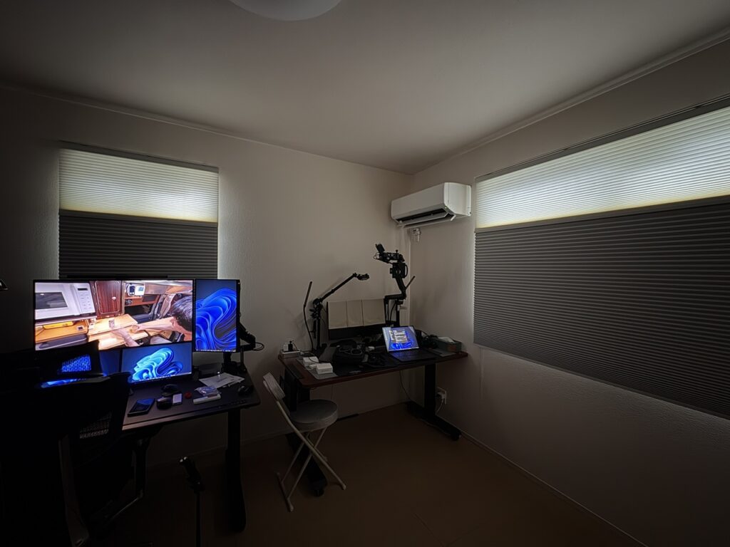 減光と遮光の上下を変更することはできませんが、どちらをどのくらい開くのかを調整することもできます。画像のように30%くらい減光シェードを開いておくと、目線より高い位置に拡散した光が広がるのでお気に入り。
