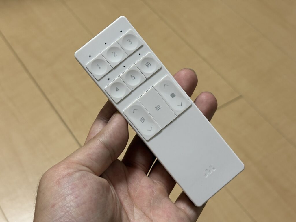リモコンは見ての通り、1から5までのボタンにシェードを割り当てでき、「田」のボタンで登録したシェードの一括操作。リモコン中央で遮光・減光の独立動作と、すべての動作を停止するボタン。緊急停止としても使えます。