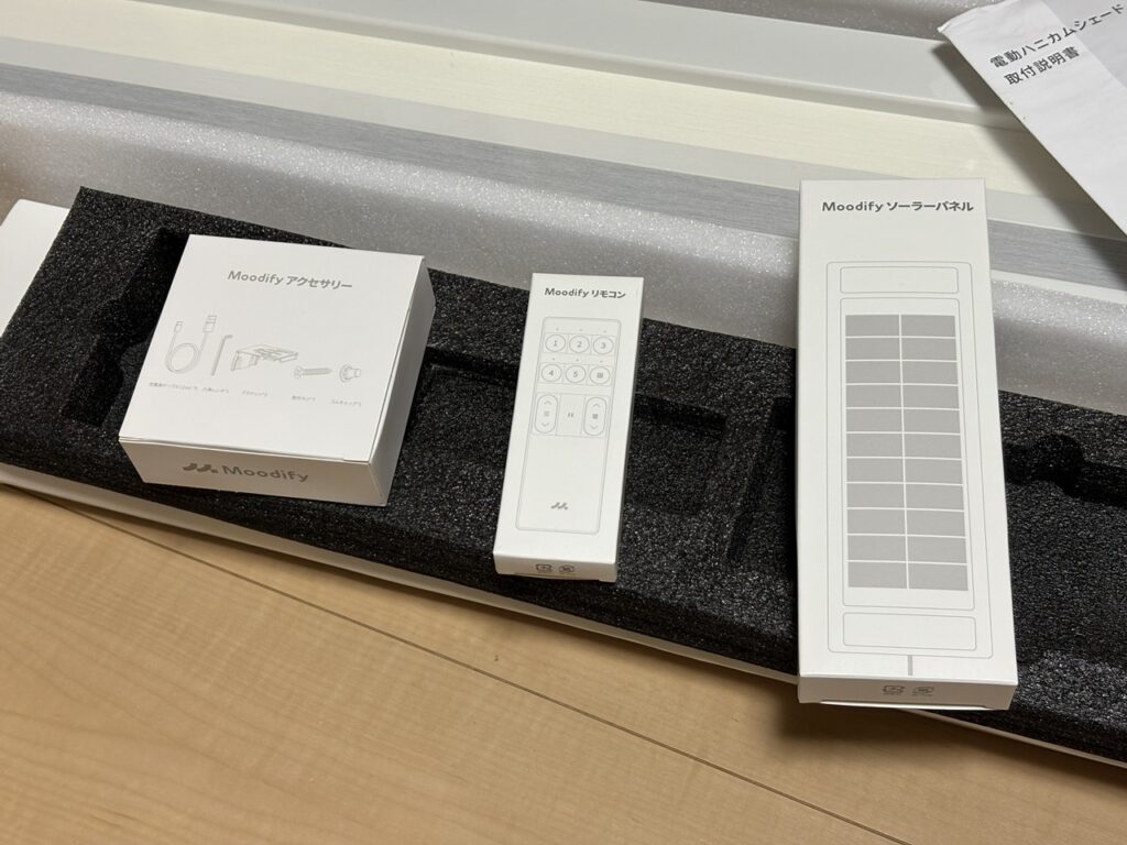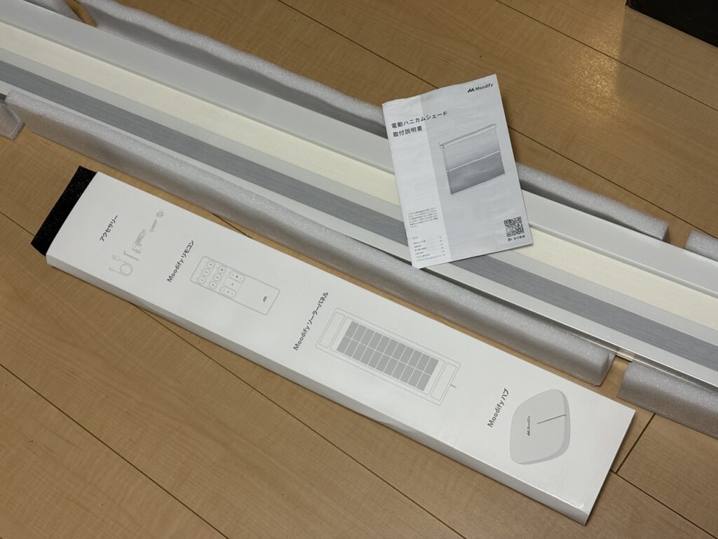Moodify電動ハニカムシェードの内容物は以下の通り。