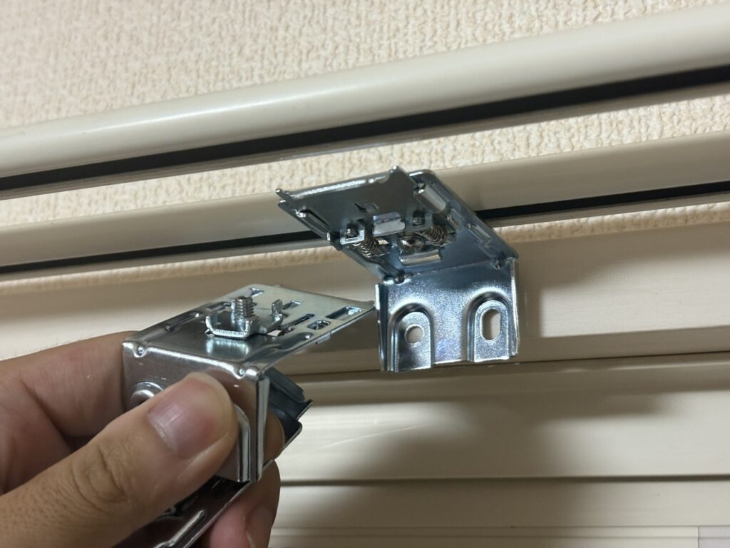 内部がバネ構造になっているブラケットにシェードの上部を押し付けるだけで噛み合う仕組みで、取り付けは簡単。横幅1,500㎜を超える場合は2人で作業したほうがいいですね。