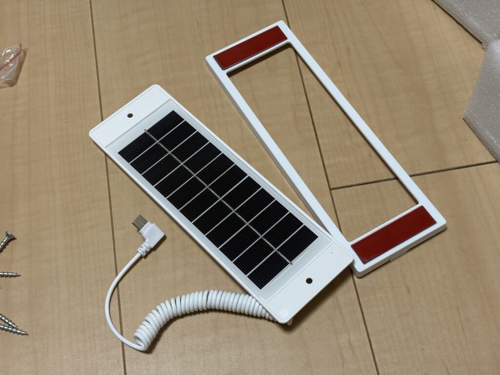 ソーラーパネルは「ソーラーパネル本体」と「ソーラーパネルホルダー」に分かれているので、ホルダーのみを粘着テープで固定します。