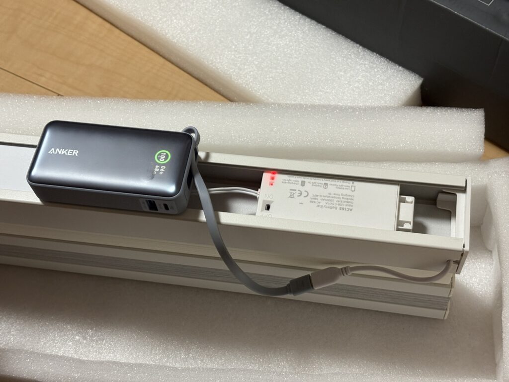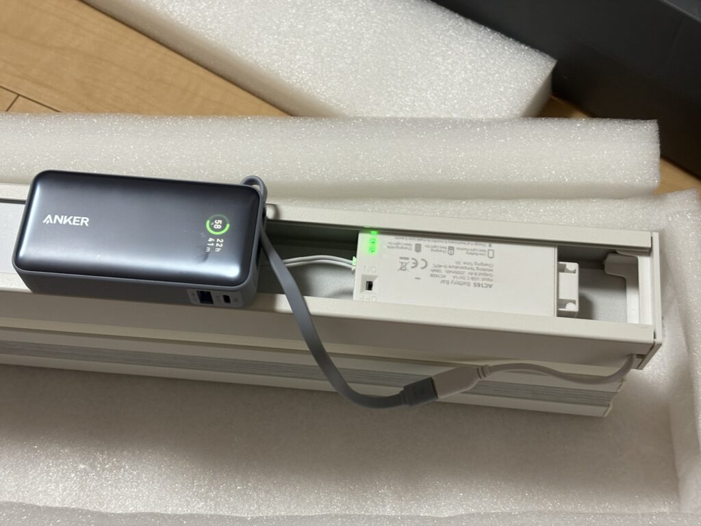初回は満タンまで充電することが推奨されているようなので、ソーラーパネルを接続するケーブルにモバイルバッテリーをつないで充電しました。ランプが緑になったら満タン。