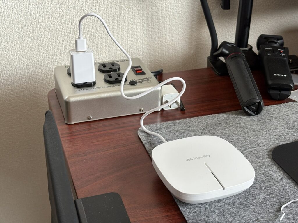 MoodifyハブはコンセントにつなぐだけでOK。とくにハブ本体を触って設定することはありません。