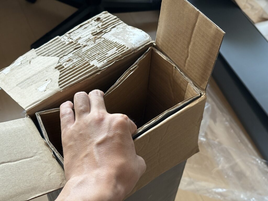 これも箱を廃棄するときに撮影したものですが、様々な長さに対応できるスリット構造で2重になっており、合わせて保護用のクッション材も使われています。たとえ箱がボコボコになっても中身は守られる構造なので安心。