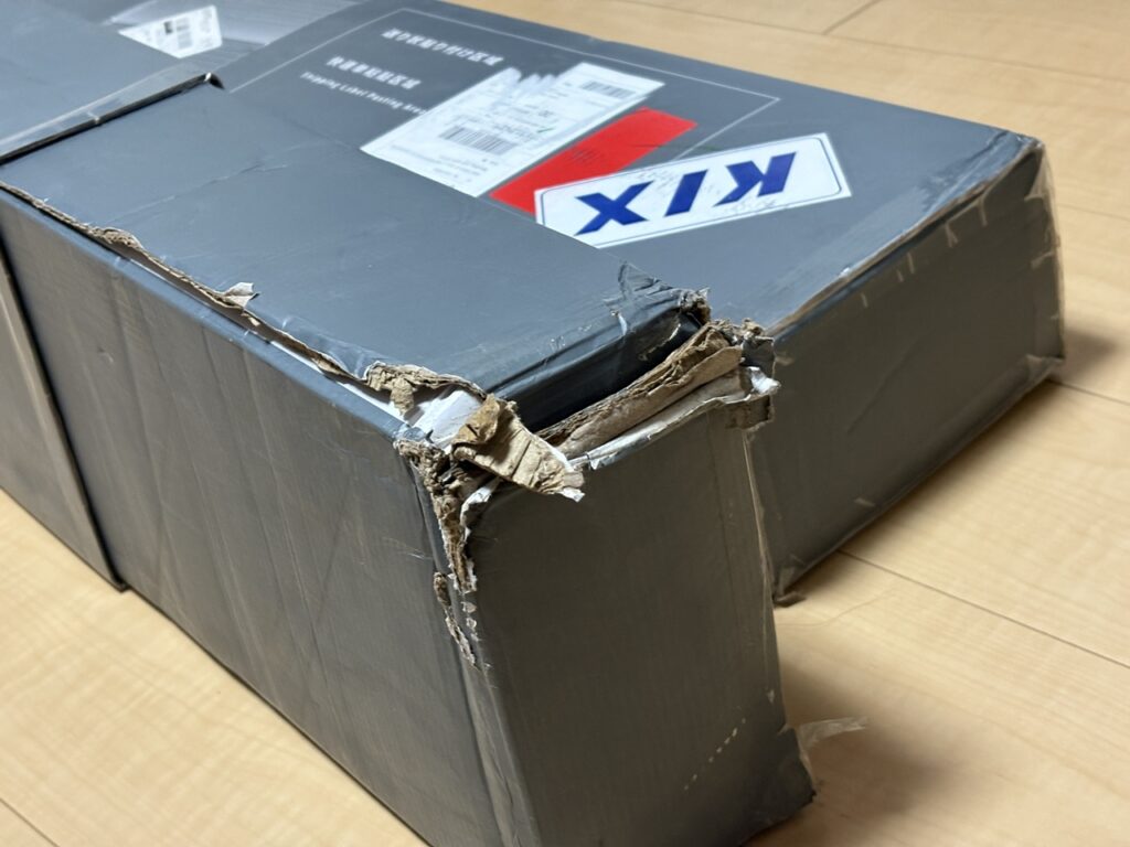 箱はけっこう…を超えたレベルでボッコボコ。今回はレビュー用に単体で海を渡ってきたのでこうなってしまったのだとか。実際にリターンとして届く時には皆さんの注文がまとまって国内に入るので、ここまでの損傷にはなりにくいとのこと。(中身は無事でした。)