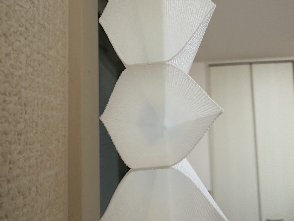 肝心のシェードですが、横から見ると六角形が縦に連なる構造になっています。厳密にはハチの巣のように正六角形が隙間なく並んでいるわけではないので「デザイン的なハニカム」です。