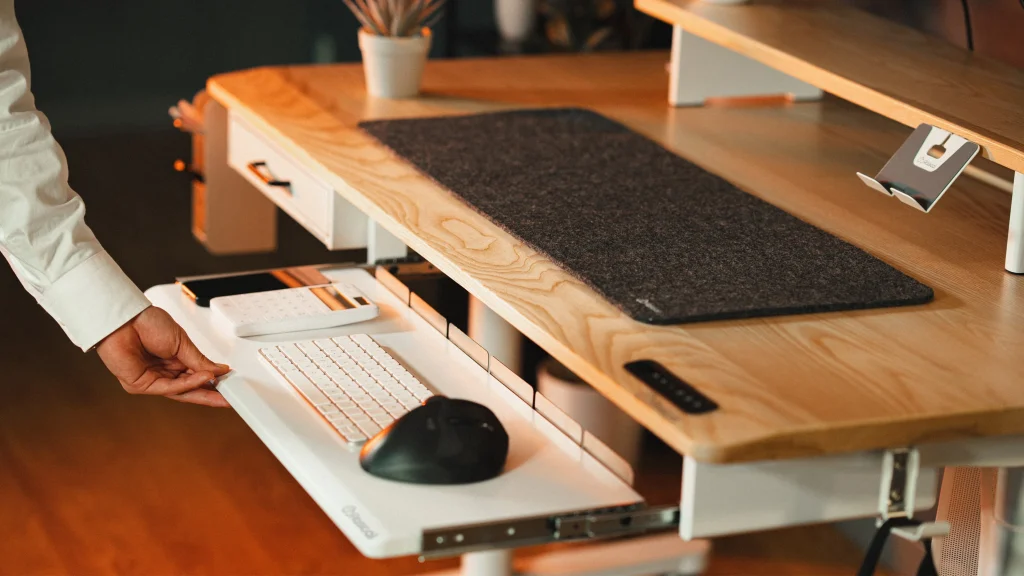 ↳ デスクの可能性を広げる、マグネットスマホスタンド - キーボードトレイ