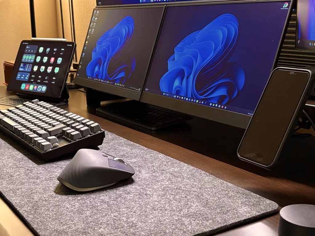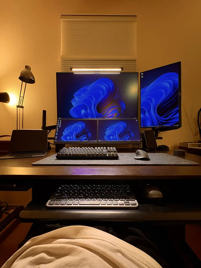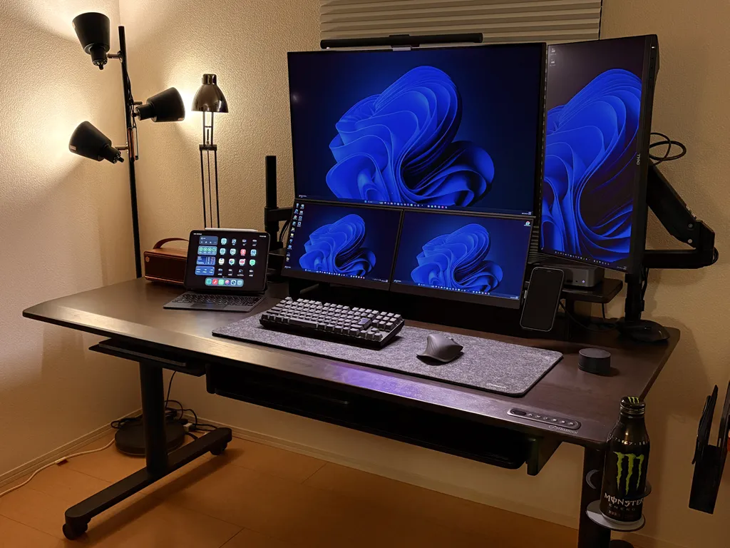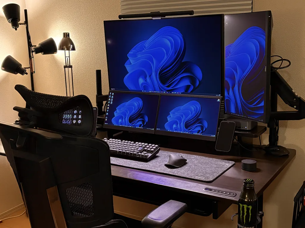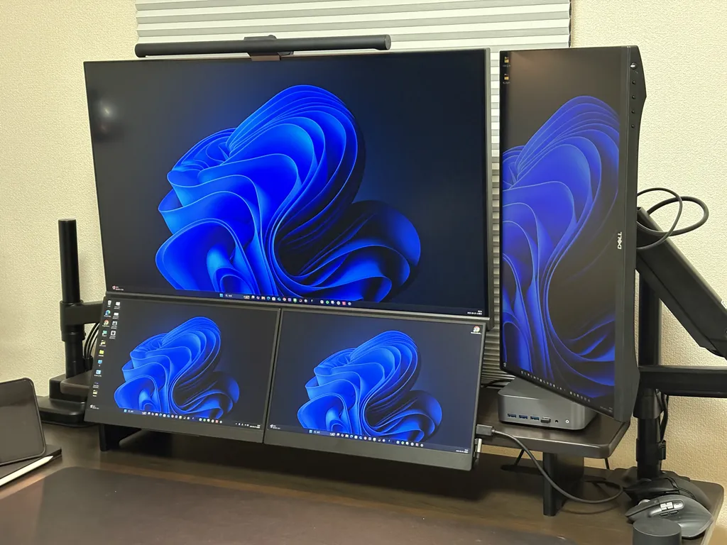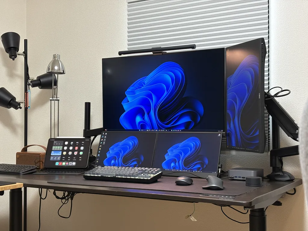 このようなポストで全体像を紹介したこともありましたが、ラシカルのデスクセットアップはこの写真の右側。ノートパソコンからミニPCに乗り換えたタイミングでノートパソコンを縦配置モニターに変更しましたが、メインモニター&サブのモバイルモニター×2枚の構成はそのまま継続。