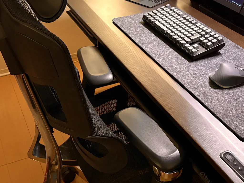 当たり前ではあるのですが、デスク下にキーボードトレイや引き出しを設置するとデスク天板が厚くなったような状態になります。デスク天板スレスレにアームレストの高さを設定しているので、当然デスク下に収納できなくなります。
