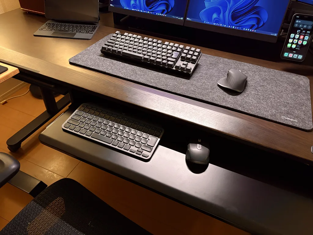 さらにメインのキーマウ+サブのキーマウを同時にスタンバイ状態にしておくことができるようになりました。サブは主に持ち運び用途で活用しているロジクールセットです。