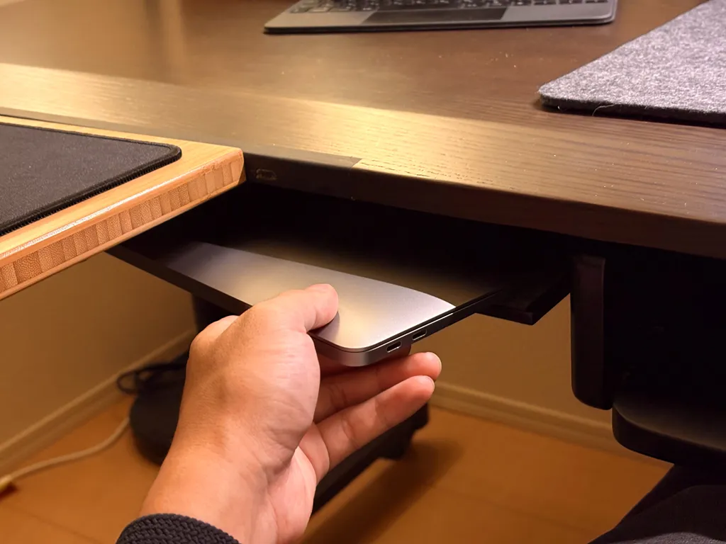 左を向けば収納してあるノートパソコンに手が伸び、デスクの上でも膝の上でも快適に作業を移行することができるようになりました。