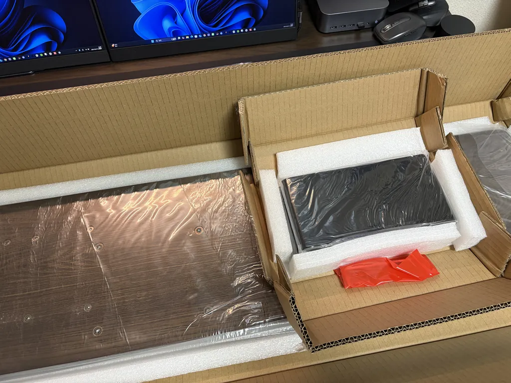 これもラシカルの工夫で、縦長段ボールの横開封はスペースとるじゃないですか。おそらくデスクの上で組み立てやすいようにこのような梱包なのかと。過去のレビューでも梱包については言及しましたが、ラシカルは気配りの神なんです。(勝手に思っているだけですが。)