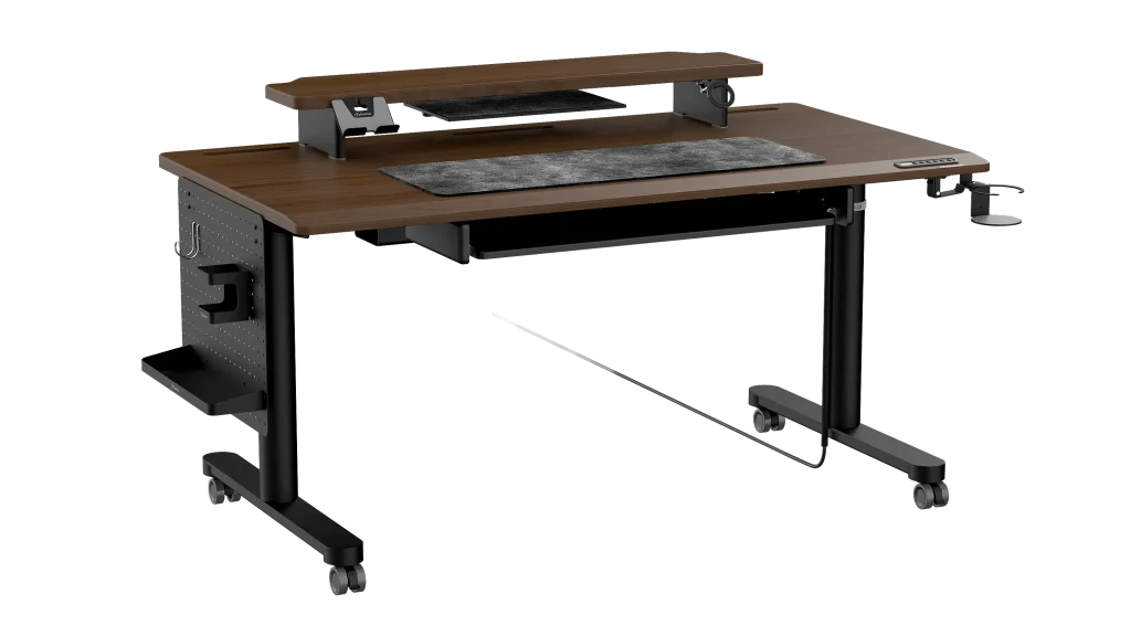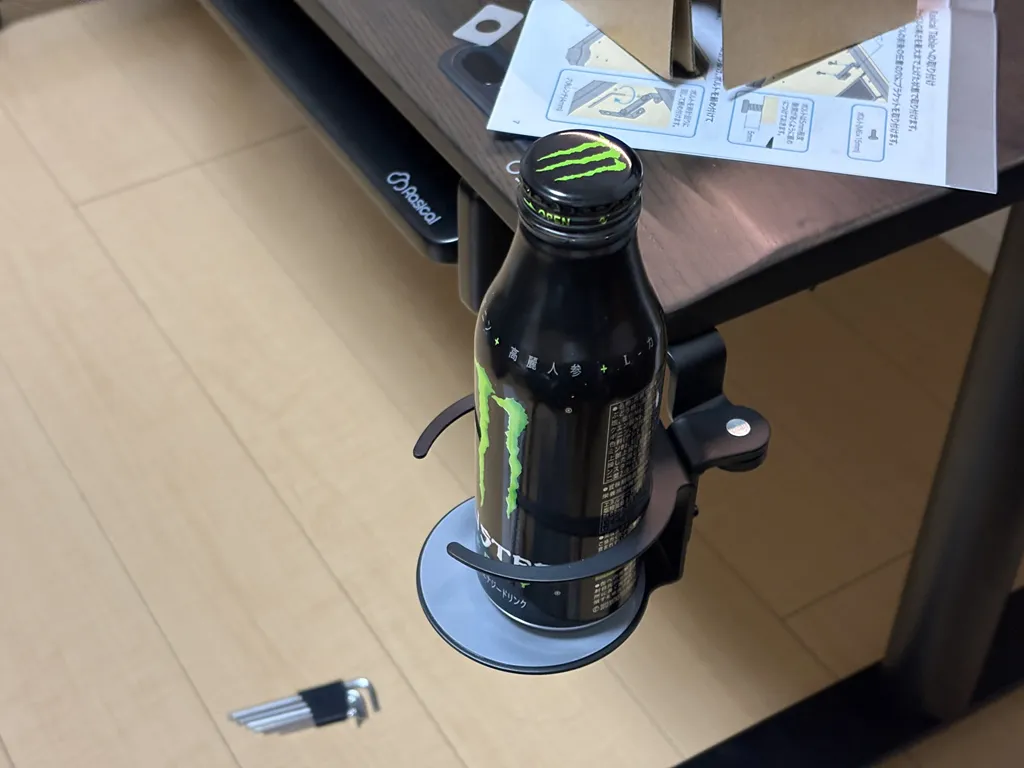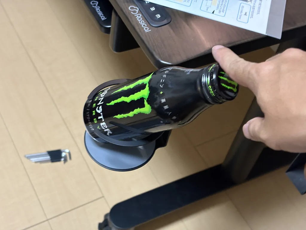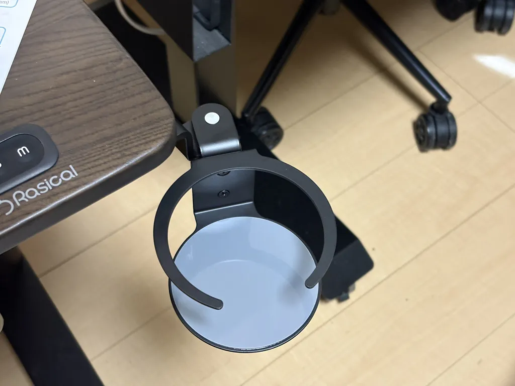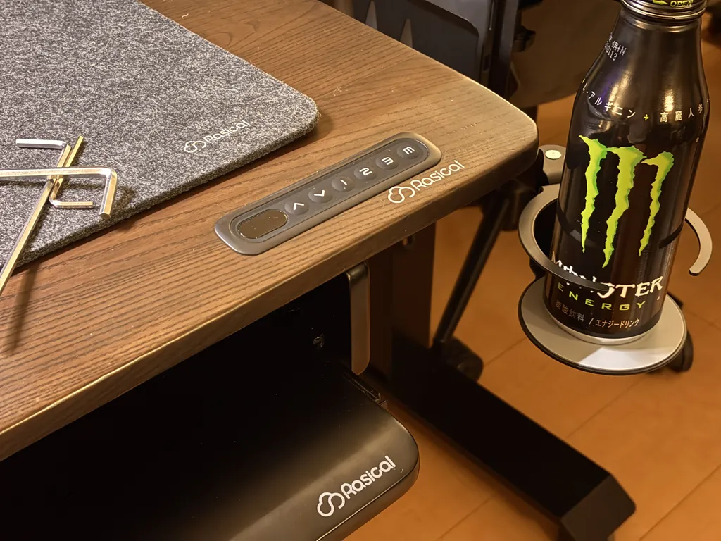 このまま右を向けばドリンクホルダーとデスクの昇降コントロール。