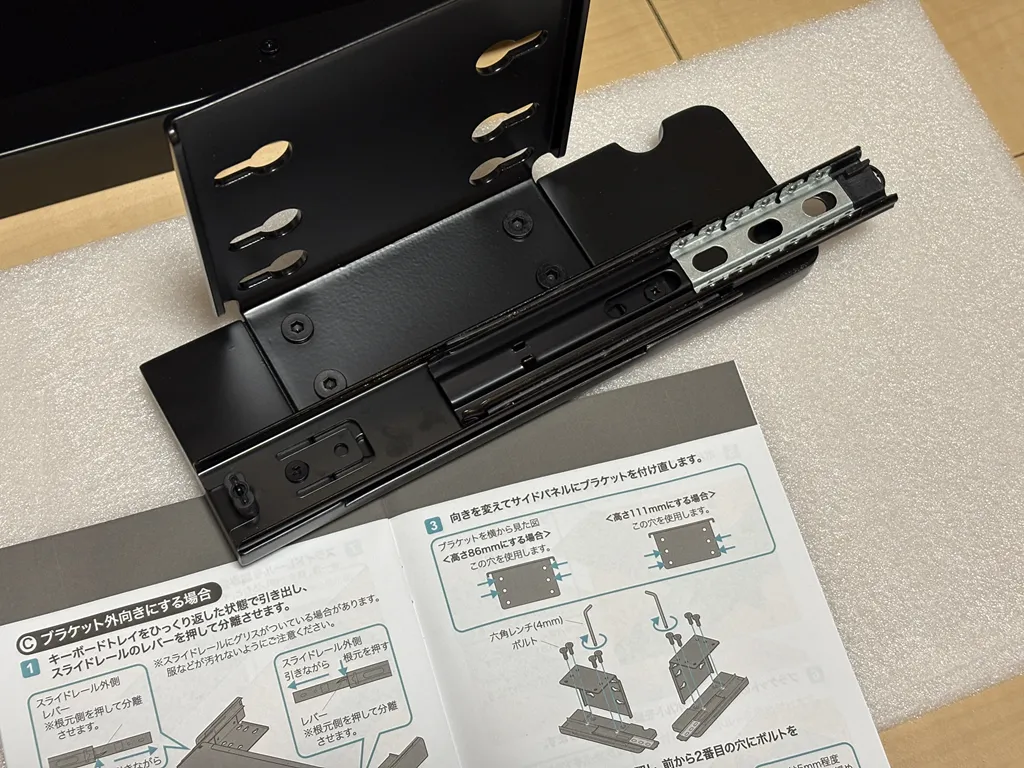 キーボードトレイの導入を検討されている方は【机の厚さが86~111mmほど拡張されてしまうこと】と、【スライド幅が185mm】、【戻る方向のロックがない】という3点を確認したうえで使用シーンを想定して購入してください。、(安いものではありませんので…)