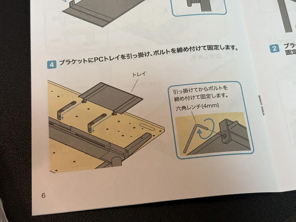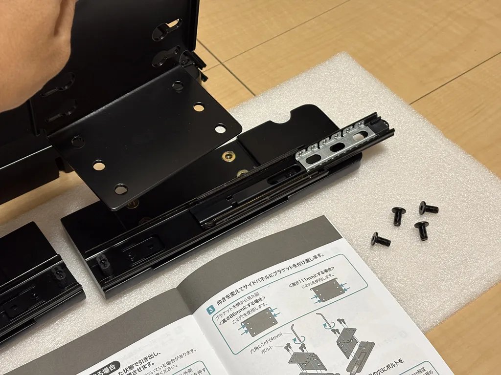 組み立てはネジ止めのみで簡単。まあ、デスクシェルフはどこの製品でも組み立て手順は同じかと思います。