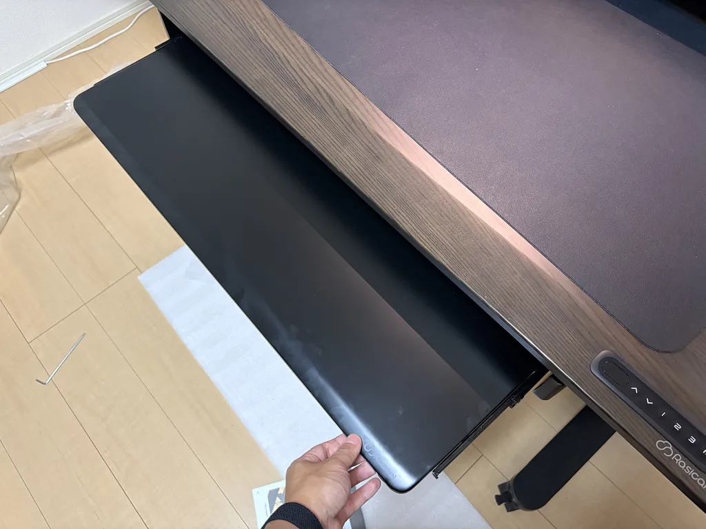 ちょっと説明しにくいのですが、収納時は勝手に出てこない(展開されない)ように引っかかりがあるんです。でも、展開時には全く抵抗なく収納方向へ進んでしまいます。タイピングしていても手首が当たってしまうだけで収納されてしまうのがこのトレイ。
