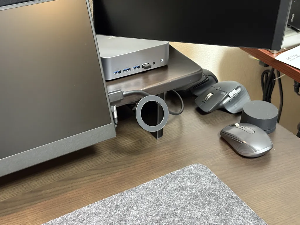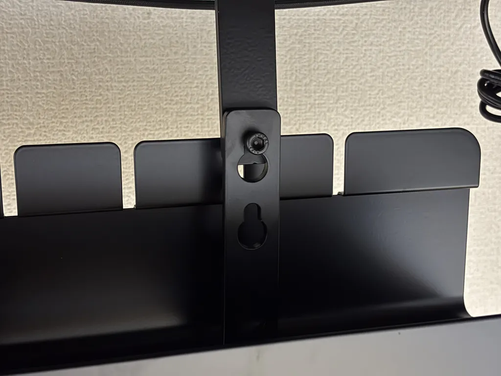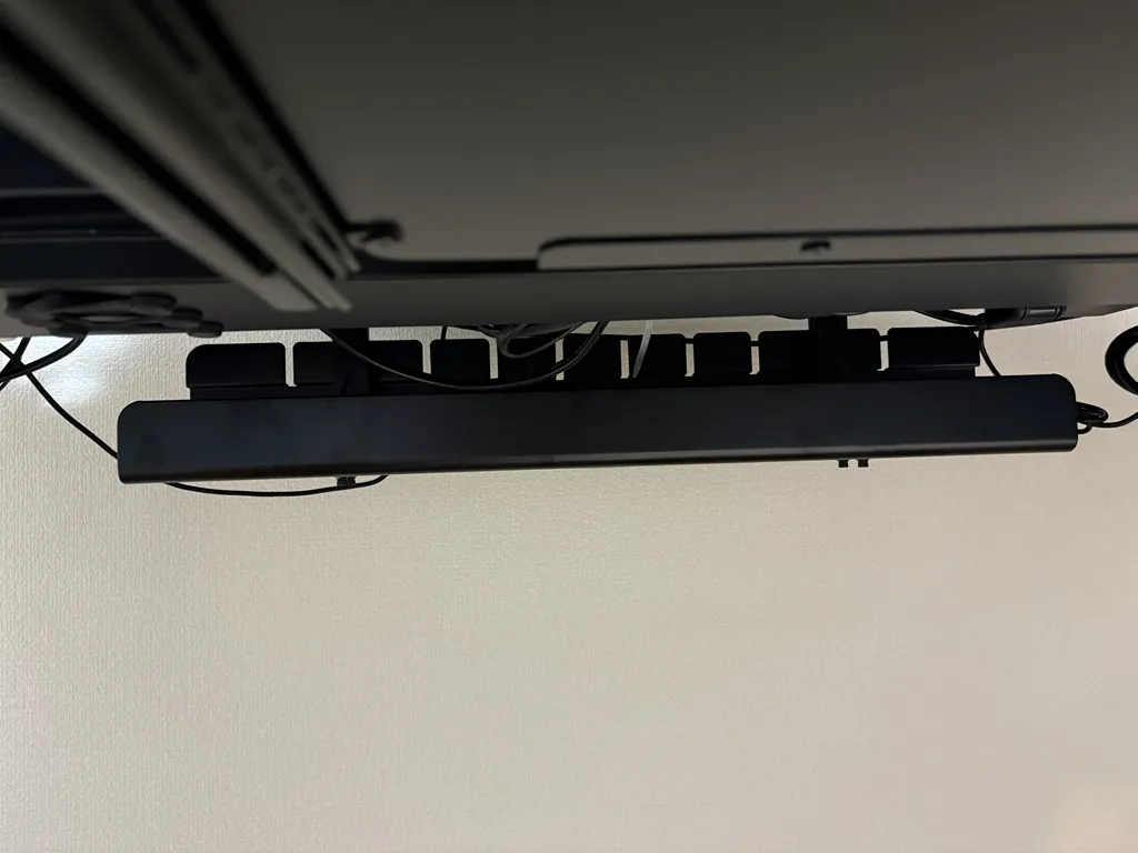 ケーブルのスリットも用意されており、使いやすさは抜群ですね。ただ、今はこのケーブルホルダー用にデスク配線を行なっていないので収納がイマイチ。