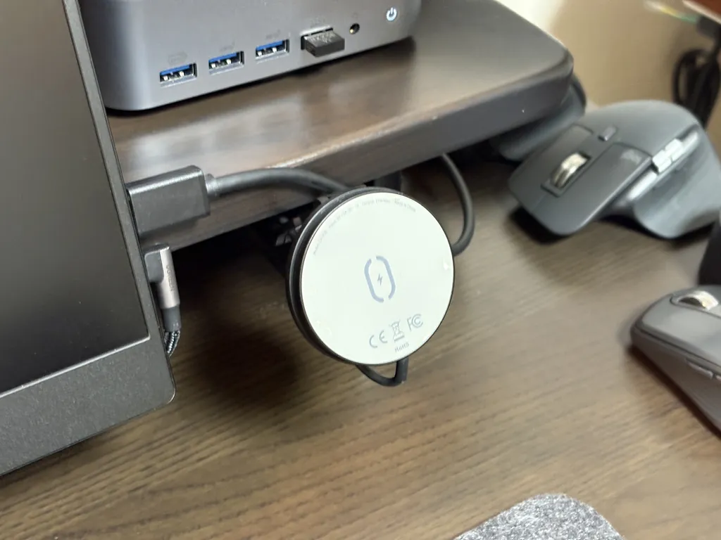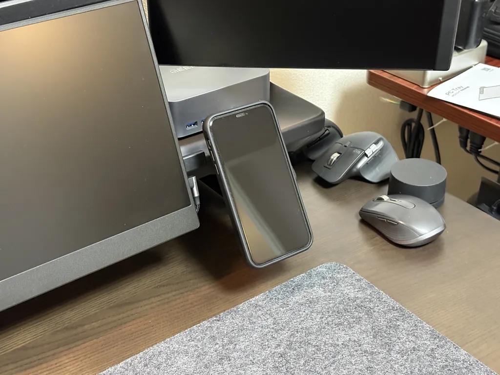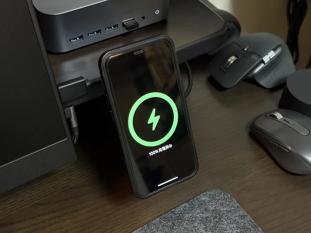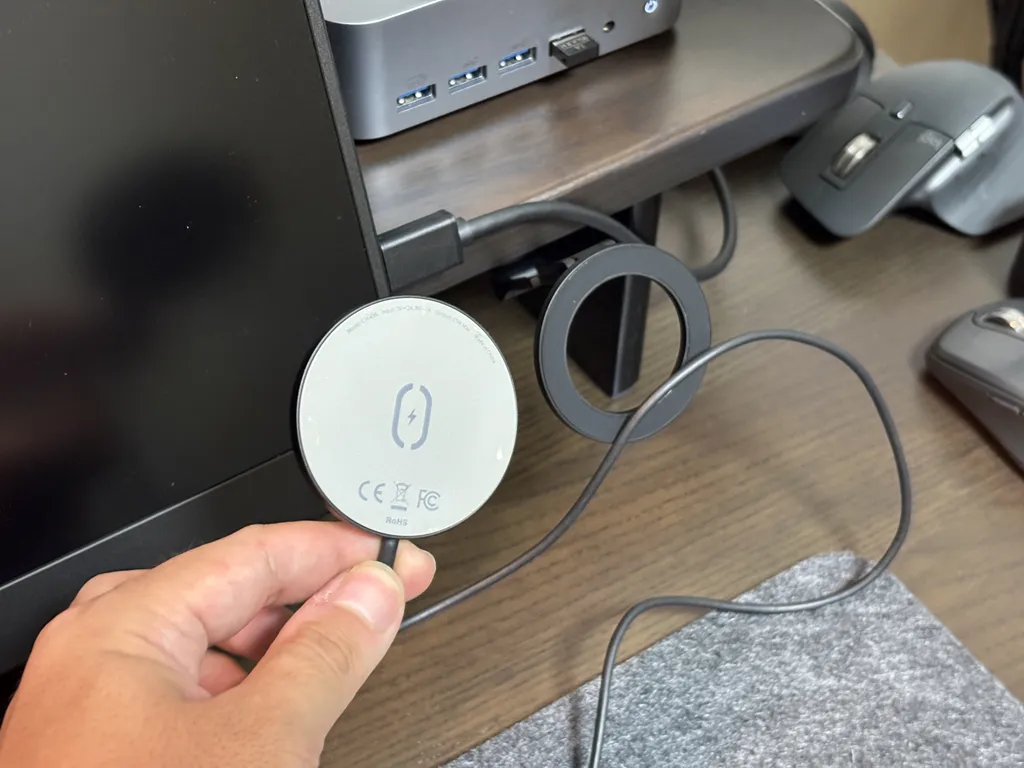 ということで、こんな感じで美しい配置を試すことに。これ、自分で考えたわけでなく「shota / 25歳の壁」さんというYouTuber兼ブロガーの方が紹介していたMagSafeスタンドで、それを流用アイディア。確かこのアイディアも動画で見た気がするのですが、ソースと言える動画を発見できませんでした。