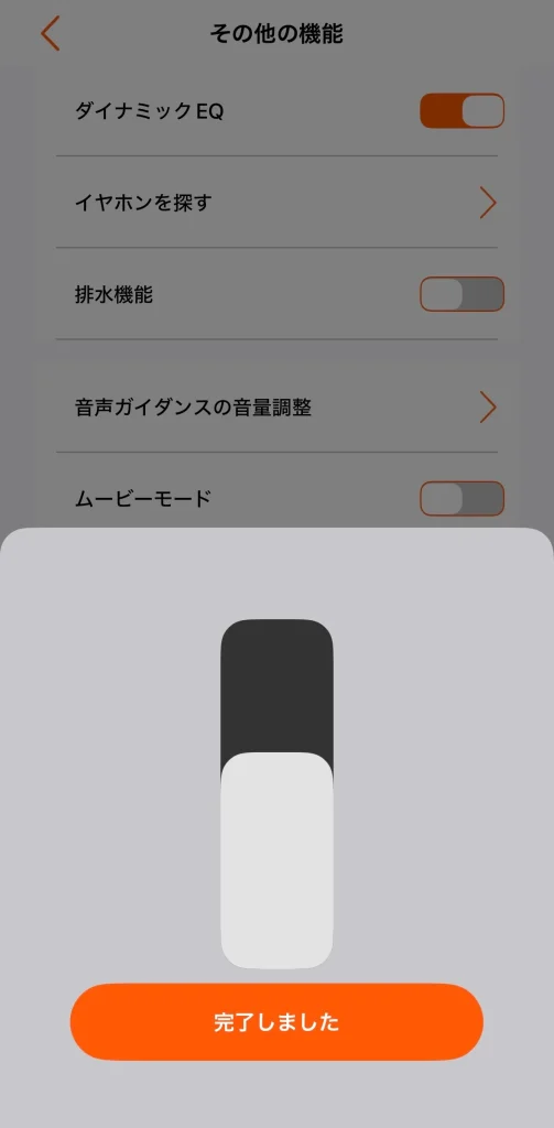 アプリ内でイコライザを設定できるのですが、デフォルト設定(アプリ接続まえ)ではダイナミックEQという選択がONになっています。イコライザを設定すると、ダイナミックEQがOFFになります。